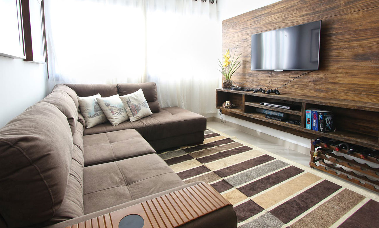 柜体细节图,原木色的板材和浅灰色布艺的沙发两种材质的综合。配比恰如其分,毫无违和感。